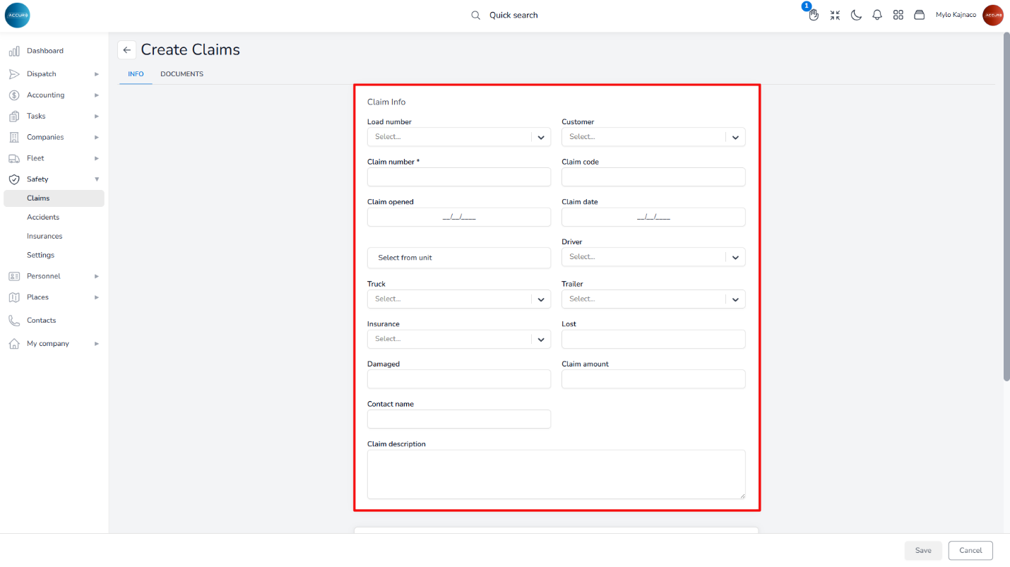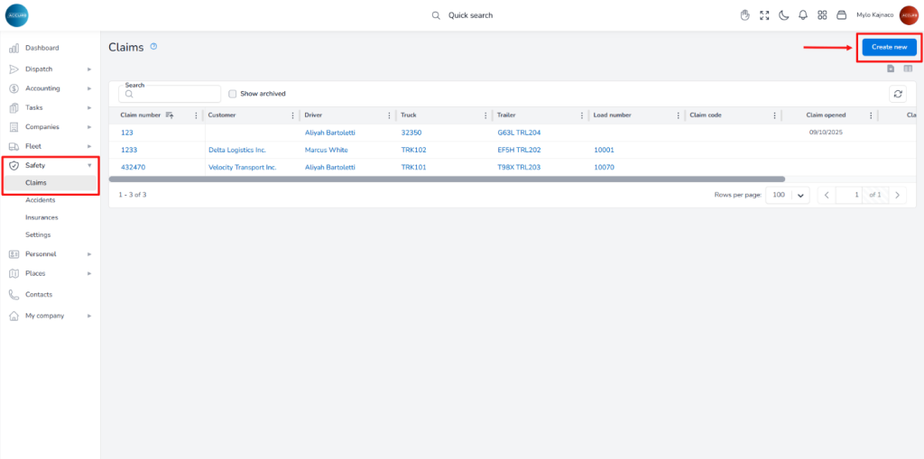 To create a claim, navigate to the left sidebar and under the Safety section, select Claims. Next, click the Create new button at the top-right corner.