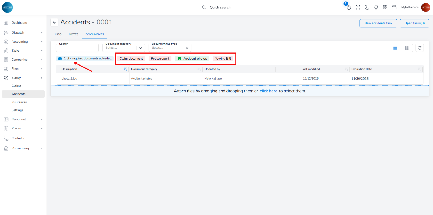 To add documents related to the accident case, go to the Documents tab on the Accident’s page. Here, you will find a red notification indicating any missing required documents, along with a blue notification that displays the number of documents still needing to be uploaded.