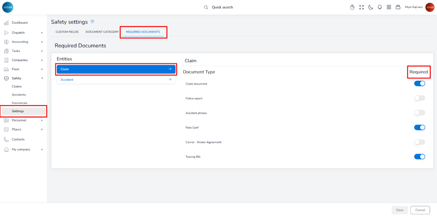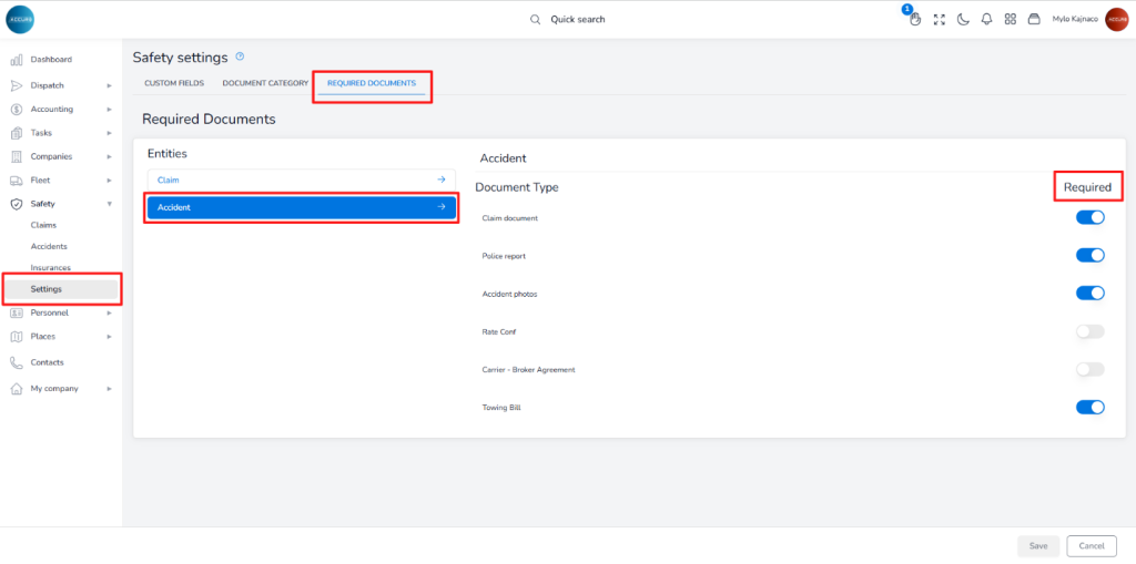 To specify which documents are required, go to the Settings section in the left sidebar. Then, under the Required documents tab, choose the Accident entity. On the right side, toggle the button next to each document type to indicate whether it is required or not.
