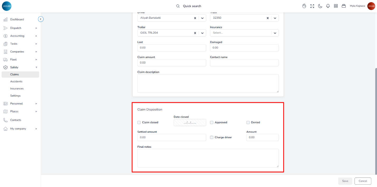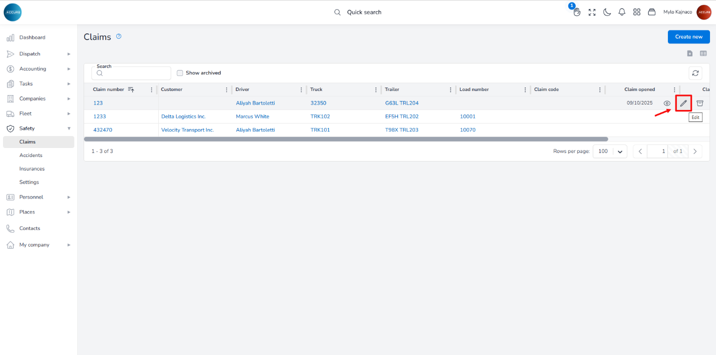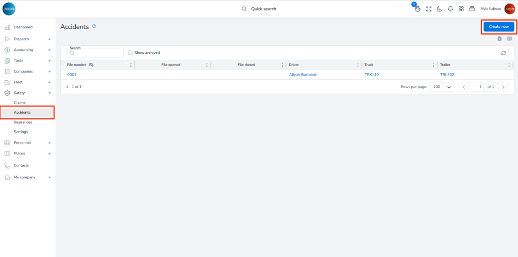 After saving the accident case, it will appear in both the Claims list and the driver’s Accidents tab.