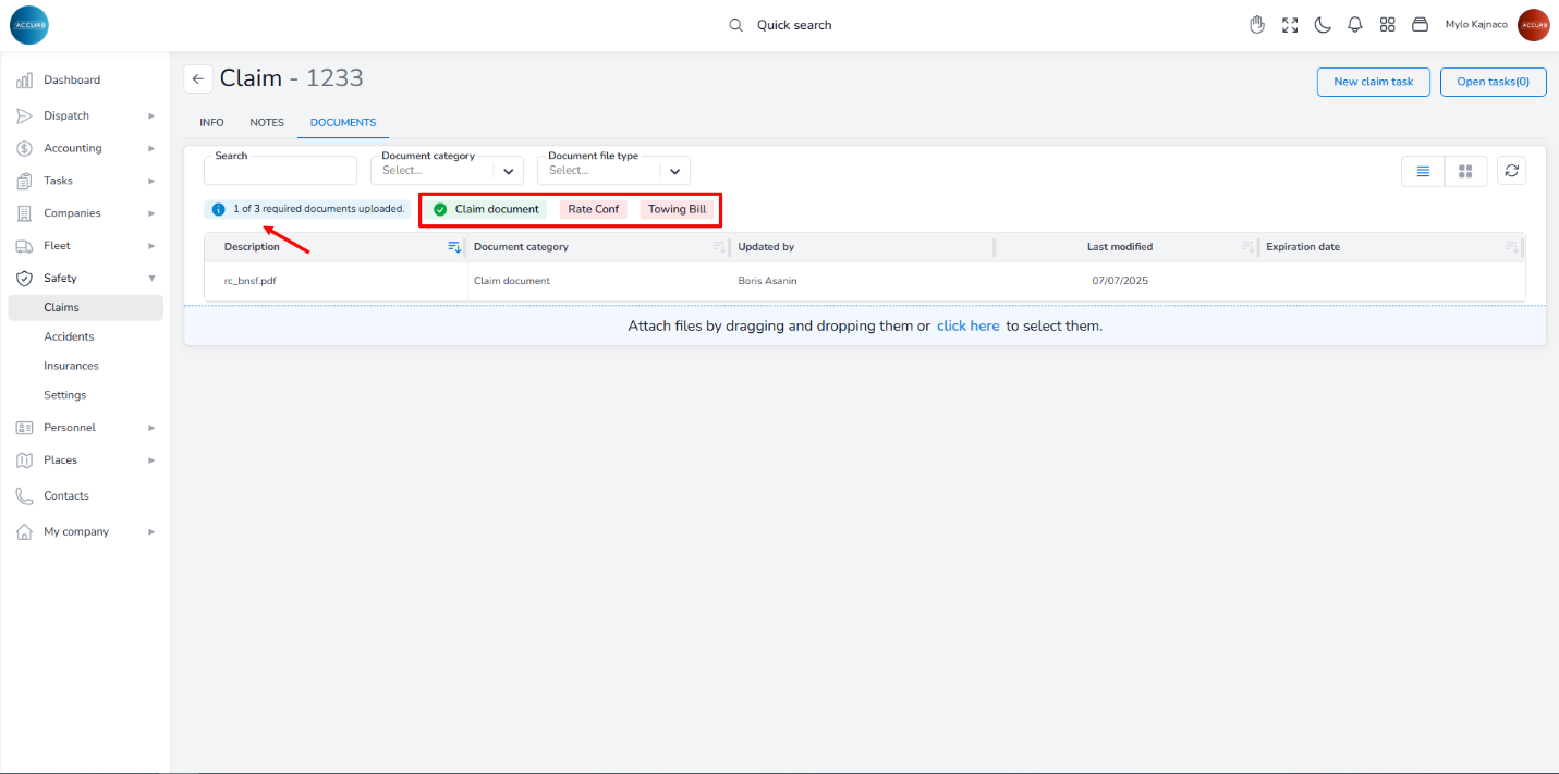 To add documents related to the claim, go to the Documents tab on the Claim’s page. Here, you will find a red notification indicating any missing required documents, along with a blue notification that displays the number of documents still needing to be uploaded.