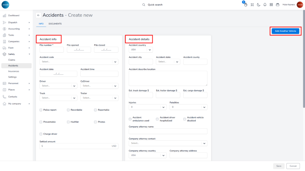 This action will open a page where you’ll need to fill out the Accident Info and Accident details forms. If additional vehicles are involved, you can include them by clicking the Add Another Vehicle button and completing the corresponding form for each vehicle.