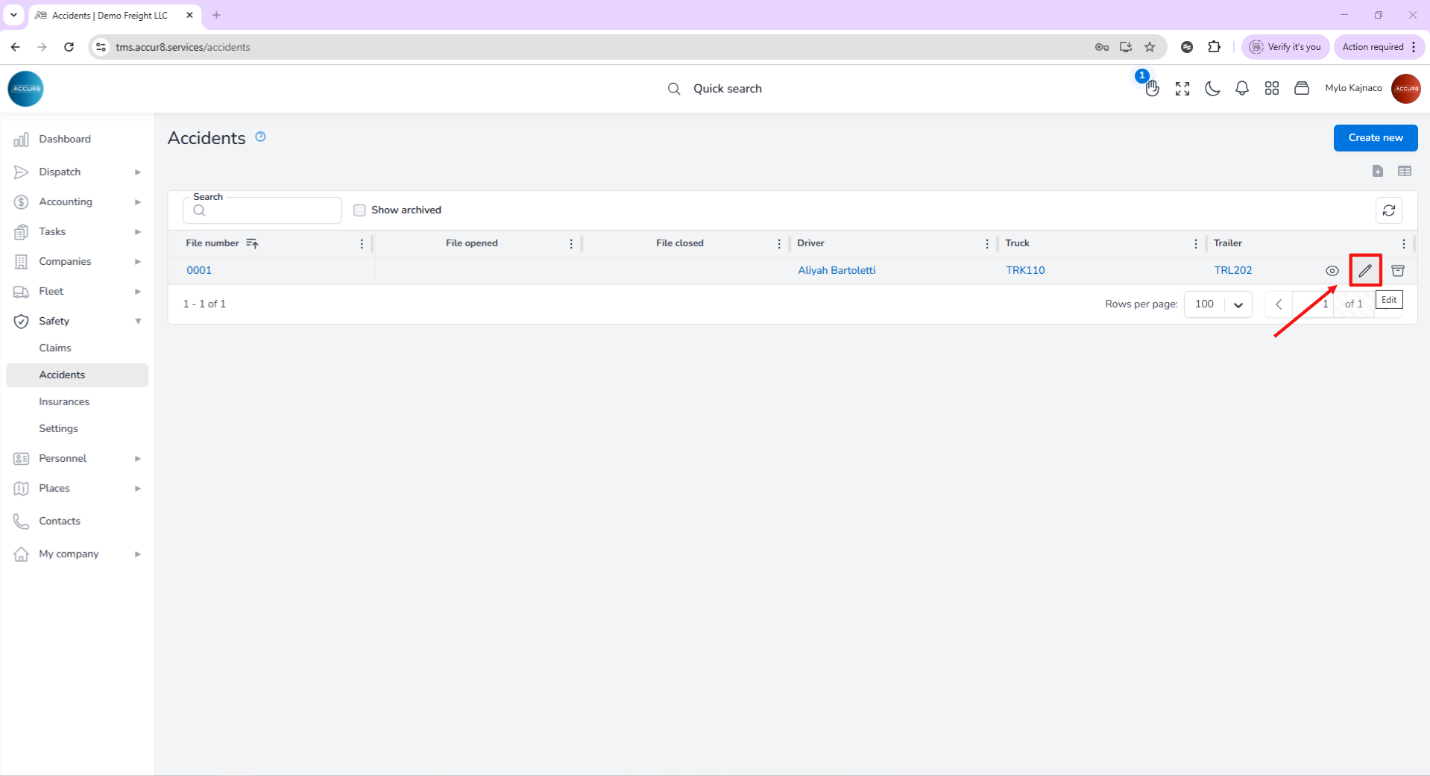 To edit an accident, navigate to the Accidents list and hover over the accident case you wish to modify. Click the pencil icon to open a new page where you can make any necessary changes.