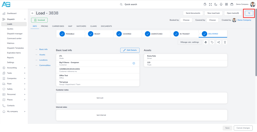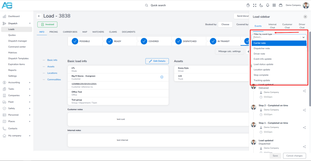 The first method is the simplest: you can view the events in the load sidebar, accessible through the hamburger menu button located in the upper-right corner of the selected load page.