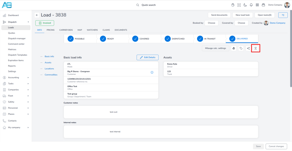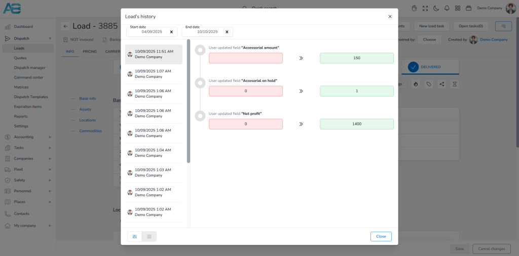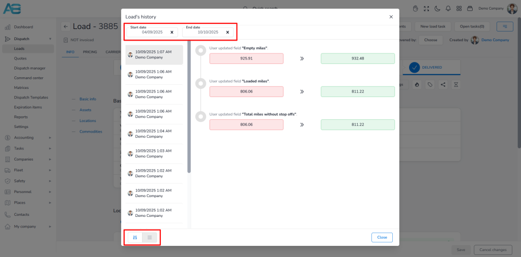 The second method provides a more detailed review through the audit history log, where you can view a chronological record of load changes. You can access this feature by clicking the hourglass icon.