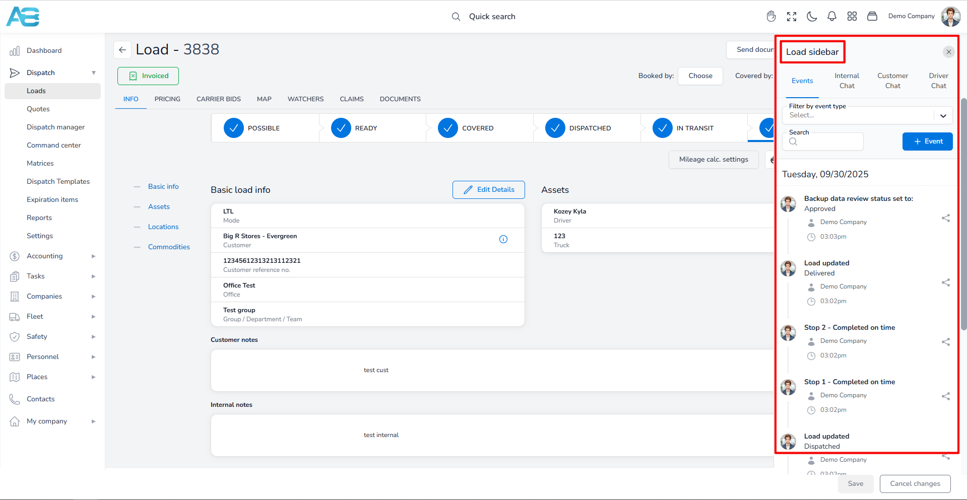 The first method is the simplest: you can view the events in the load sidebar, accessible through the hamburger menu button located in the upper-right corner of the selected load page.