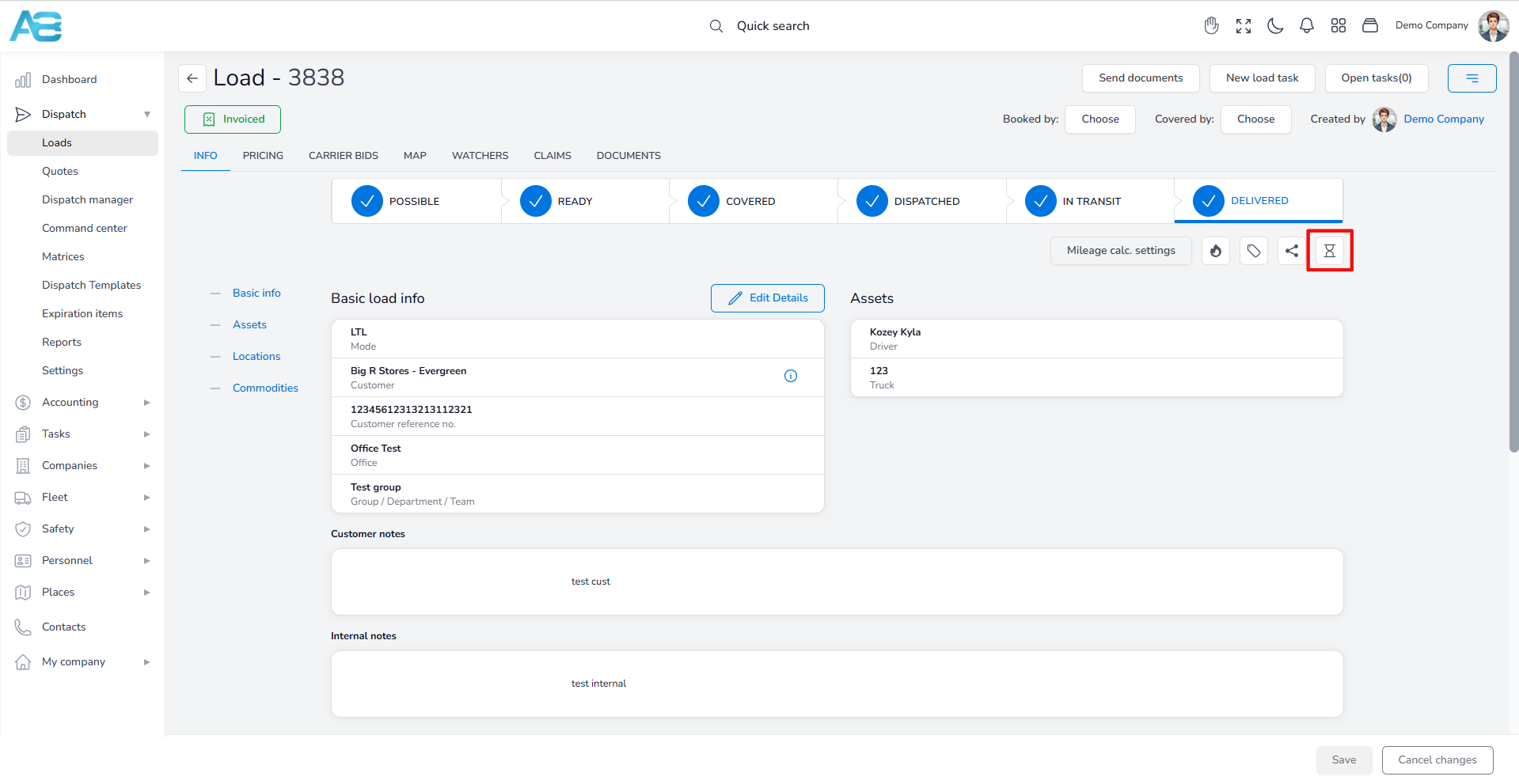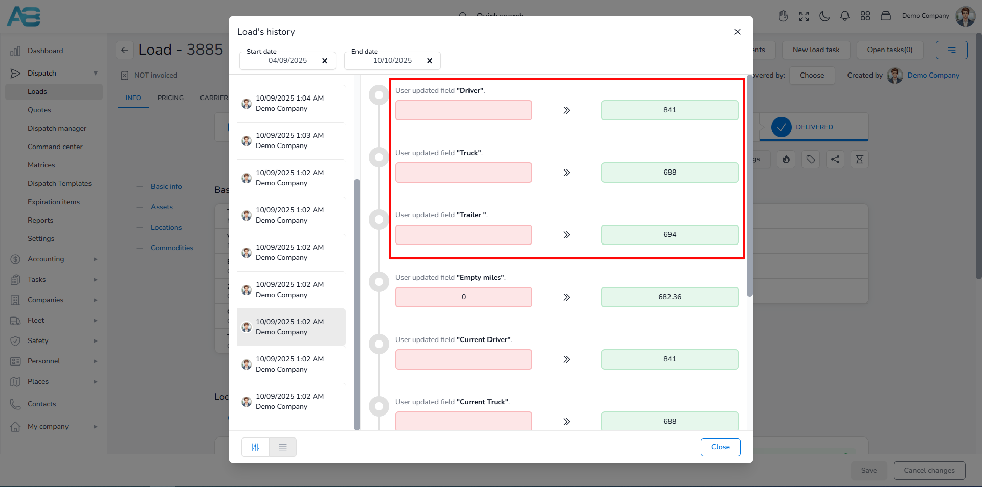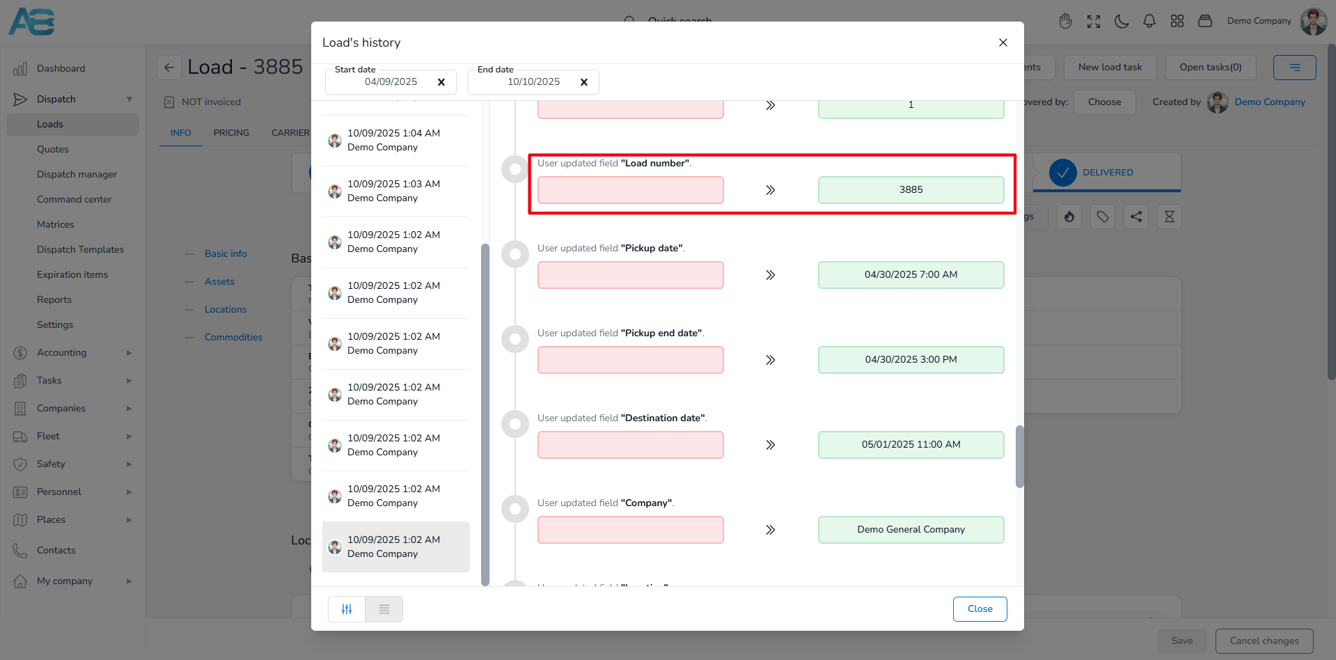 The second method provides a more detailed review through the audit history log, where you can view a chronological record of load changes. You can access this feature by clicking the hourglass icon.