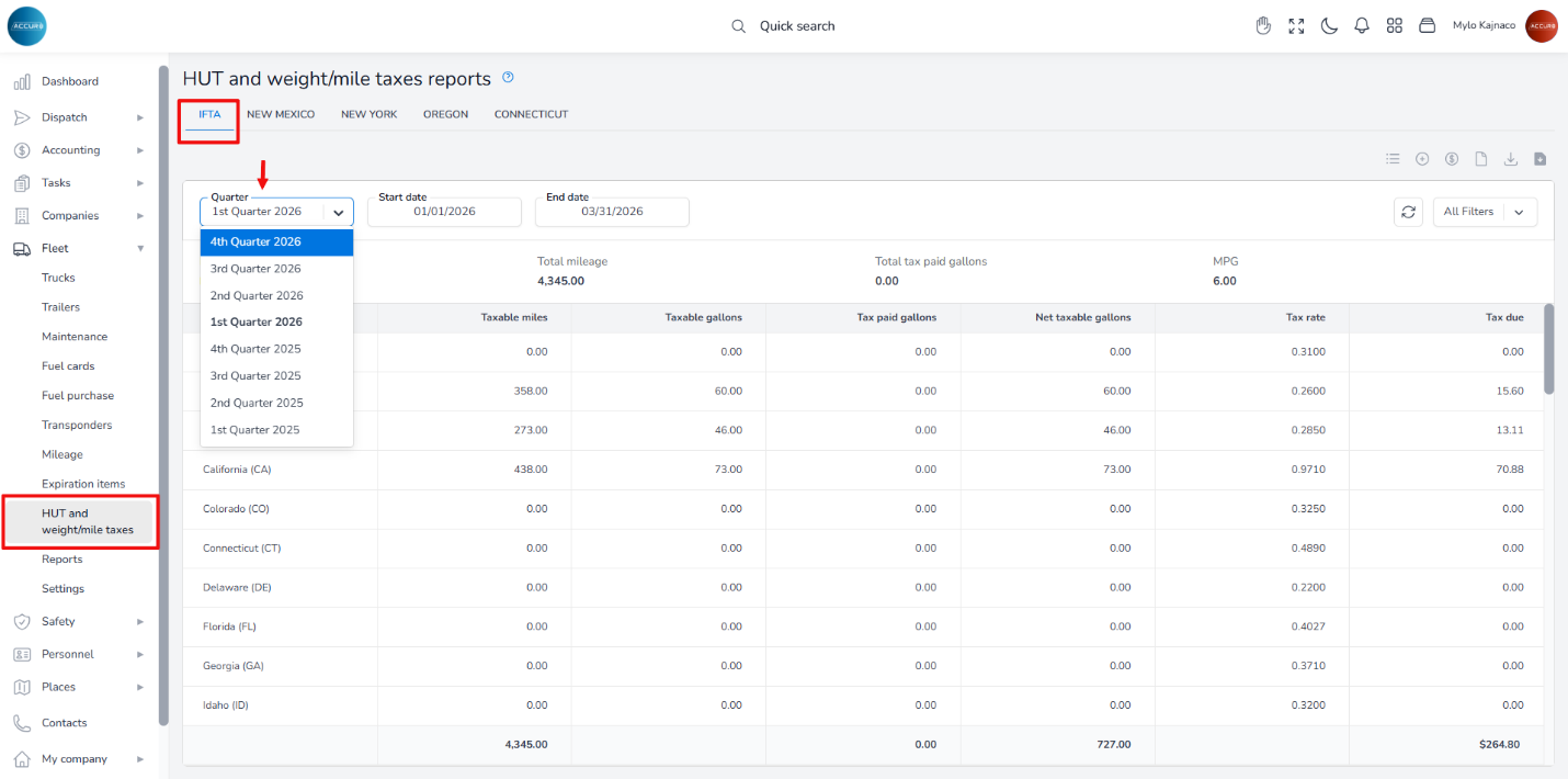 To access these reports in the ACCUR8 system, navigate to the Fleet section on the left sidebar and select the HUT and weight/mile taxes reports option. On this page, click the IFTA tab. Next, choose the Quarter option, and all reports recorded in the system will be displayed.