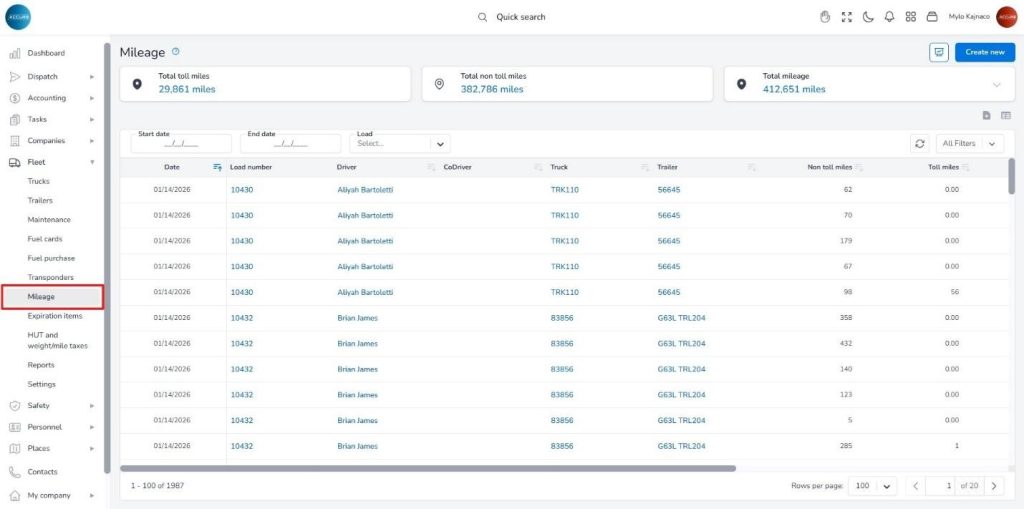 You can access the mileage log in the Fleet section under the Mileage option at: https://tms.accur8.services/mileage.