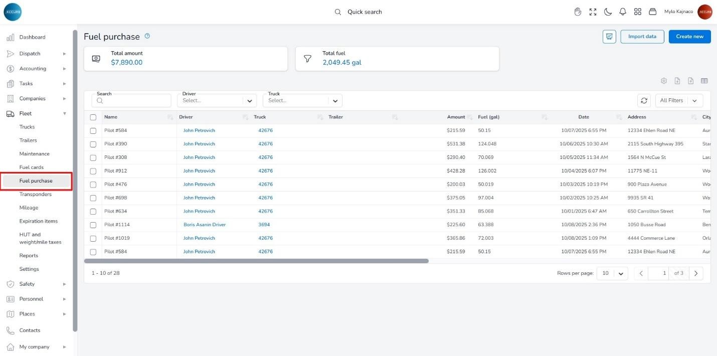 Fuel data is available under the Fuel Purchases option at: https://tms.accur8.services/fuel-purchase.