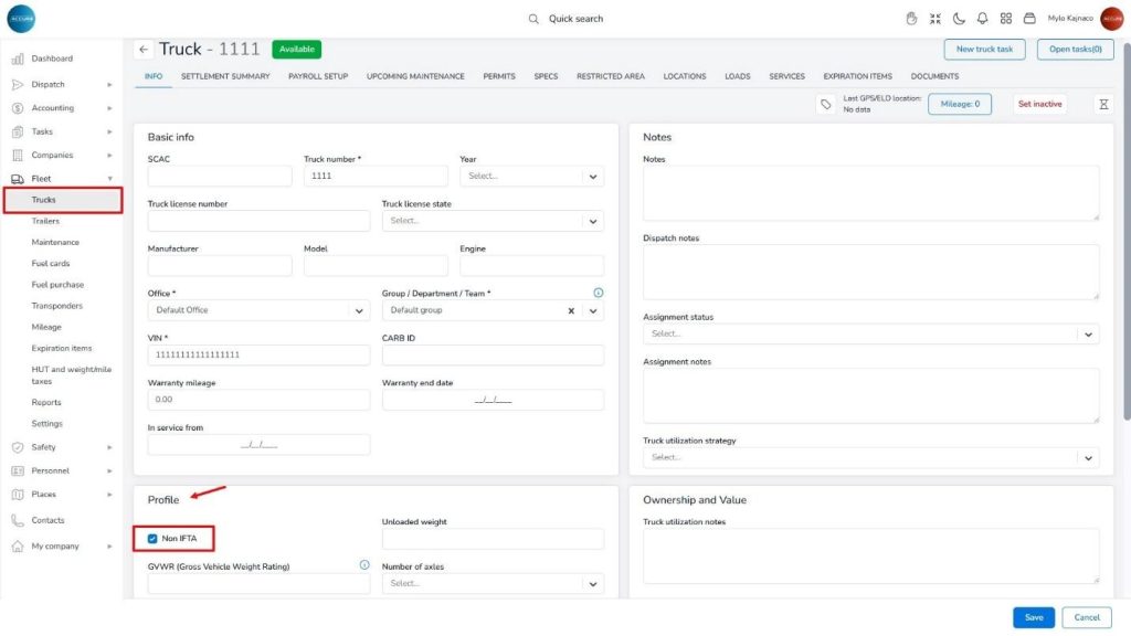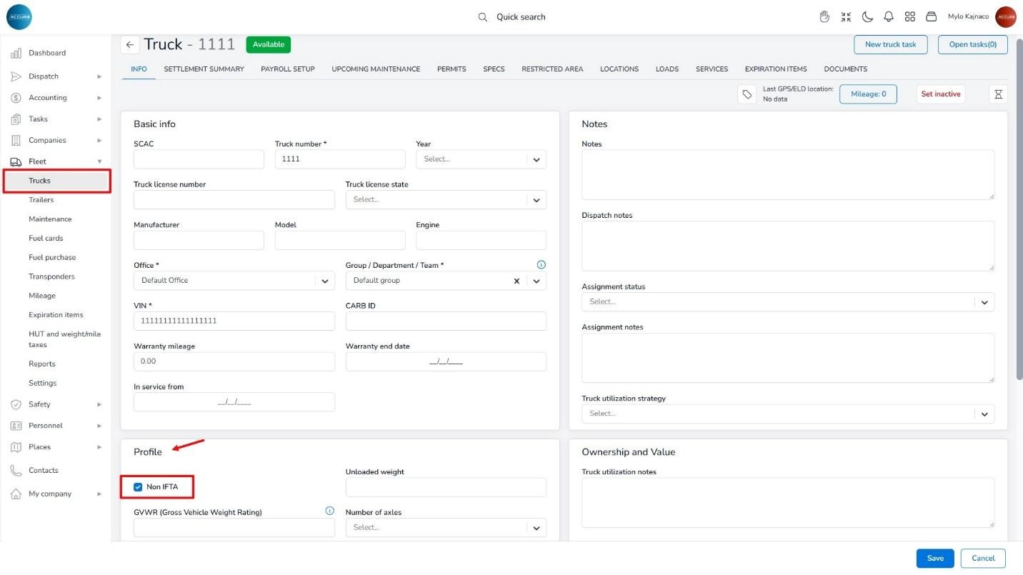 It’s important to note that the IFTA calculation includes trucks that are NOT marked as Non-IFTA. To ensure these costs are excluded from the IFTA report, you must manually set this option for each truck on its Info tab, under the Profile section.