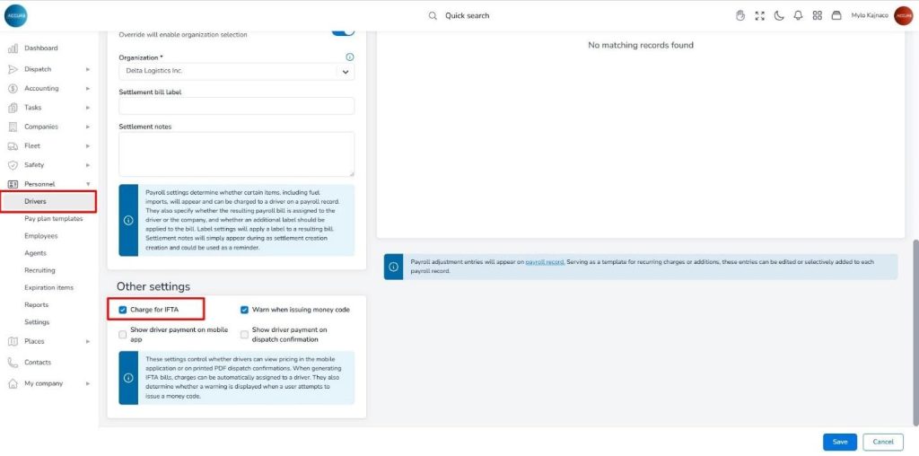 To charge a driver for the IFTA, you need to mark the Charge for IFTA option in the driver’s Payroll setup tab under the Other settings option. By doing this, charges will be automatically assigned to a driver when IFTA bills are generated.